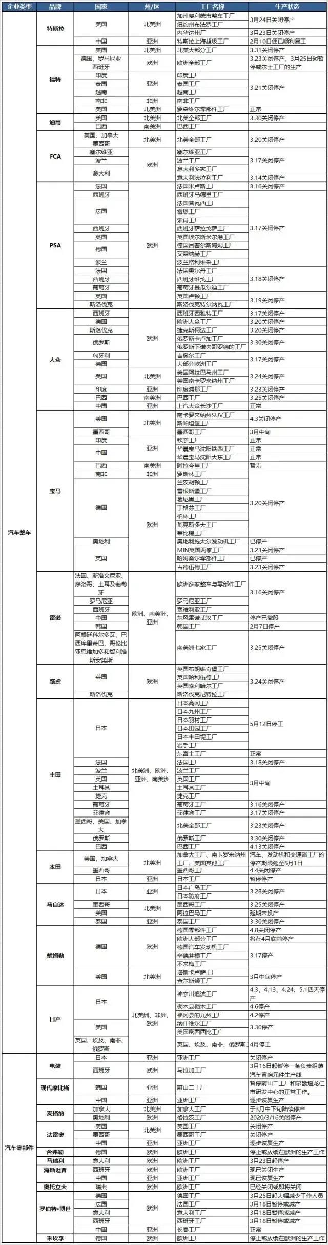 目前,國內(nèi)疫情初步得到控制,但海外疫情仍在蔓延,全球汽車行業(yè)的形勢依然不太樂觀。截止到2020年5月6日16時,全球確診病例已經(jīng)超過 363萬例,其中美國和歐洲地區(qū)是重災區(qū),歐美企業(yè)不得不停工停產(chǎn)。根據(jù)不完全統(tǒng)計,目前大概有38家跨國車企集團已經(jīng)關(guān)?;蛴媱濌P(guān)停工廠,工廠總數(shù)累計達到了150家以上。