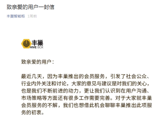 4月30日,豐巢正式上線會(huì)員服務(wù)功能實(shí)行收費(fèi),一石激起千層浪,經(jīng)過被抵制,發(fā)布公開信解釋,用戶不買賬,再被約談,5月15日豐巢科技公司道歉并修改服務(wù),這場(chǎng)沸沸揚(yáng)揚(yáng)的收費(fèi)事件才暫告一段落。